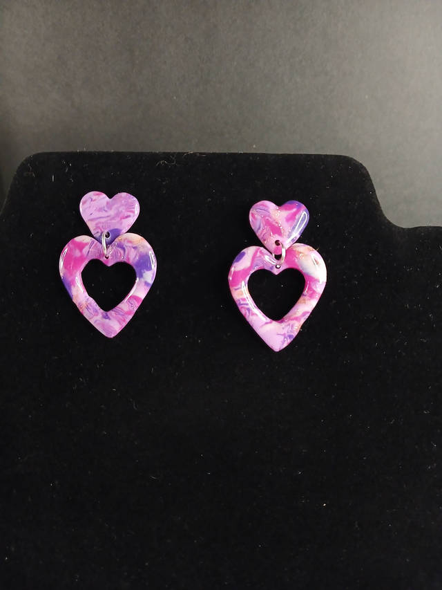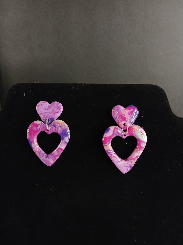 Ces boucles d’oreilles en forme de cœur ont été entièrement réalisées à la main en argile polymère, selon la technique du mokumé gané.